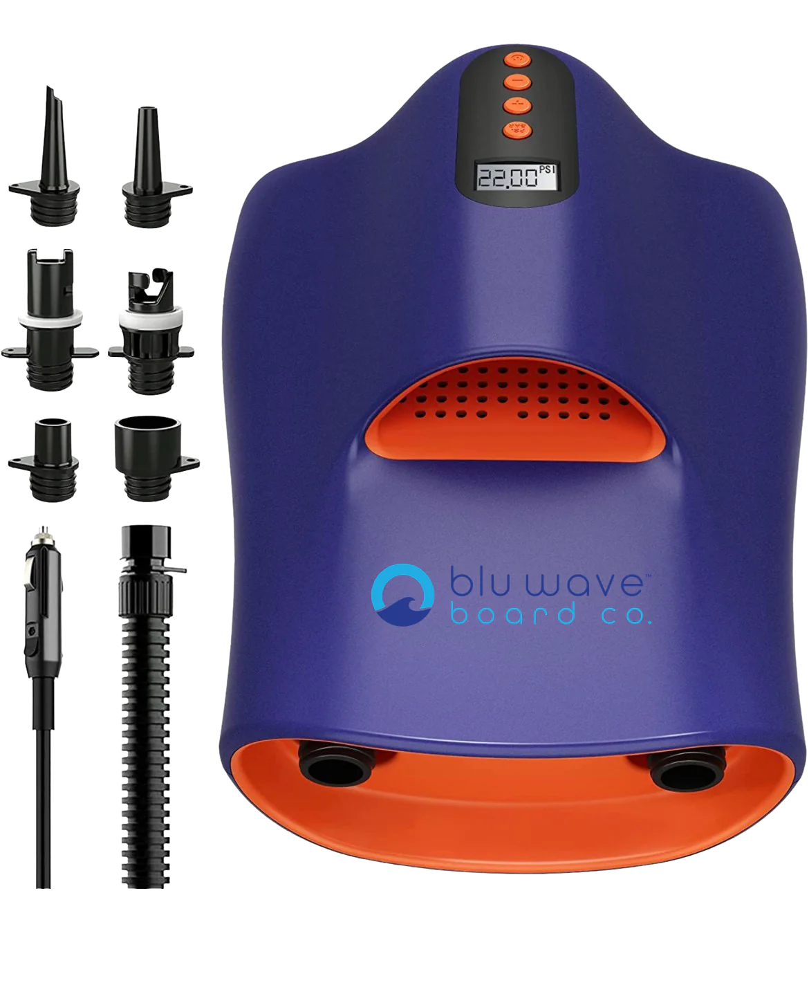 Save your energy for the water and pump up your board with an electric pump. 12 volt connection with dual inflation/deflation modes. Inflates up to 22psi. Comes with a variety of fittings to inflate everything from SUPs, water toys, mattresses etc. Digital display with PSI meter allows you to set it and forget it, with the pump disengaging when board or inflatable item reaches the selected PSI.