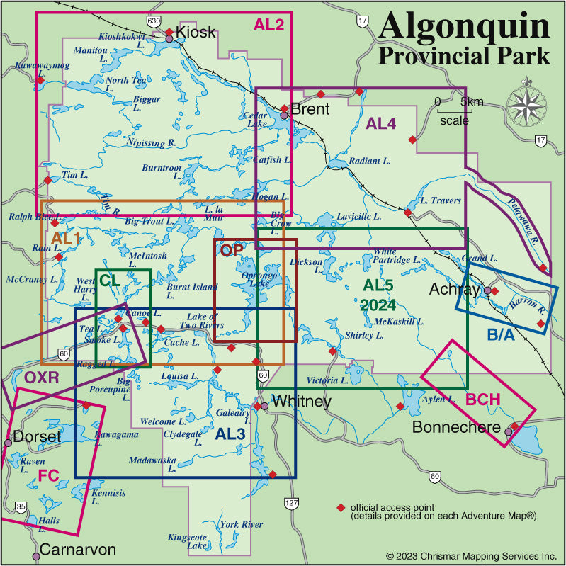 This map overlaps the Frost Centre map to the south, the Algonquin 1-Corridor North and Algonquin 3-Corridor South maps, and the Algonquin - Canoe Lake map to the east. Also consider the other larger scale Algonquin Daytripper Maps of smaller popular areas (Bonnechere River, Opeongo Lake, Canoe Lake and Barron-Achray) suitable for short trips of a week or less.