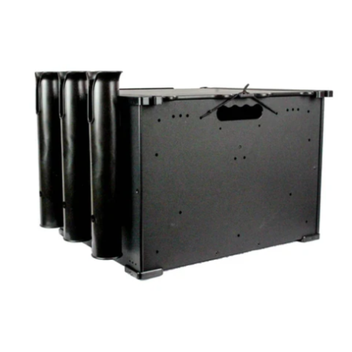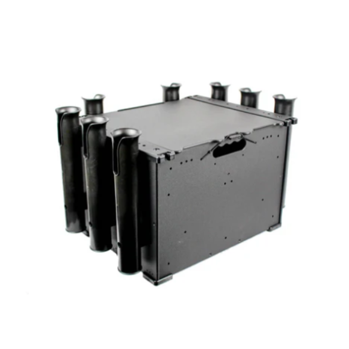 This 12"x16"x11" crate system has 10 stations for rod holders which can be mounted at a variety of angles for a total of 50 possible positions. The top rails are designed to accept MightyBolt accessories, eliminating the need for GearTracs or Mighty Mounts to attach your VISICarbon Pro, PanFish, or other MightyBolt compatible accessories.
